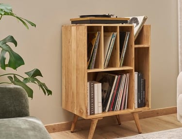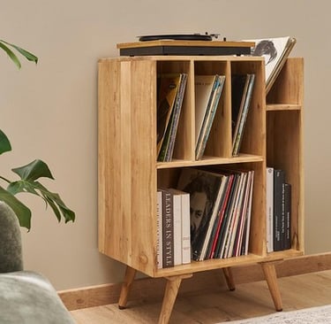 Un bon meuble doit permettre un rangement vertical stable, sans comprimer les disques. Les structures à casiers, inspirées des bacs de disquaires, sont particulièrement adaptées car elles facilitent à la fois le stockage et l’accès à votre collection.